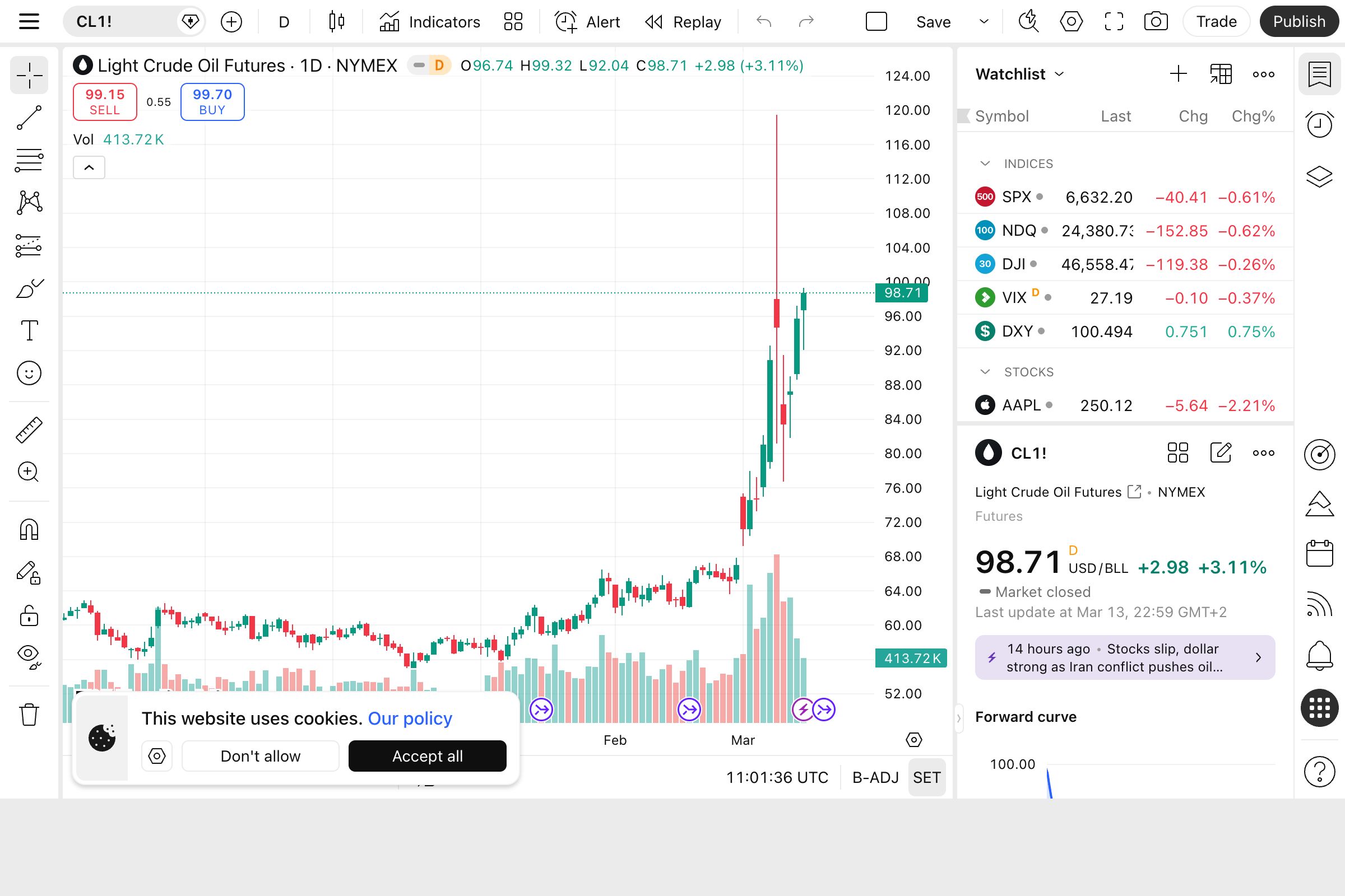 On Friday, Brent crude closed at $103.14, up 2.67% on the day and roughly 10% higher for the week. That follows last week's 27.9% surge, the largest weekly gain in oil since Covid-era trading in 2020. WTI settled at $98.71, up 3.11% and capping its second week above 8% gains. The IEA announced a record release of 400 million stockpiled barrels. It barely moved the needle.